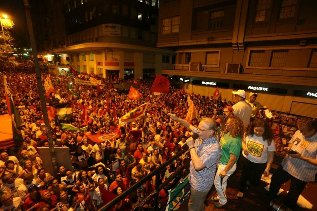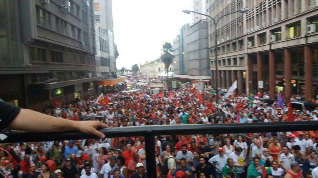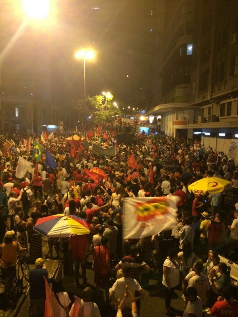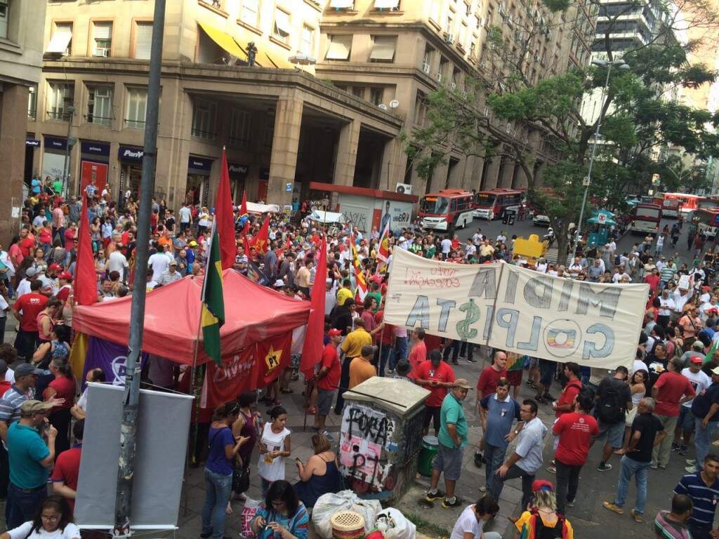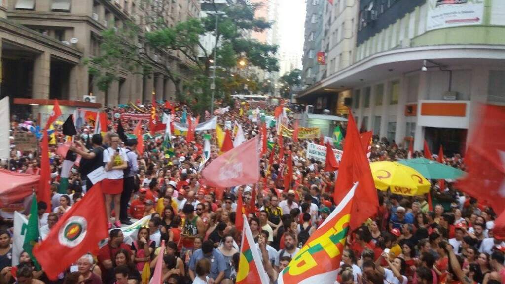 Manifestantes favoráveis ao governo Dilma Rousseff fazem caminhada pela avenida Borges de Medeiros na noite desta sexta-feira. O grupo se concentrou na Esquina Democrática, área Central de Porto Alegre. O Comando de Policiamento da Capital informou que a área conta com reforço de efetivo na região atendida pelo 9º BPM (Batalhão de Polícia Militar).