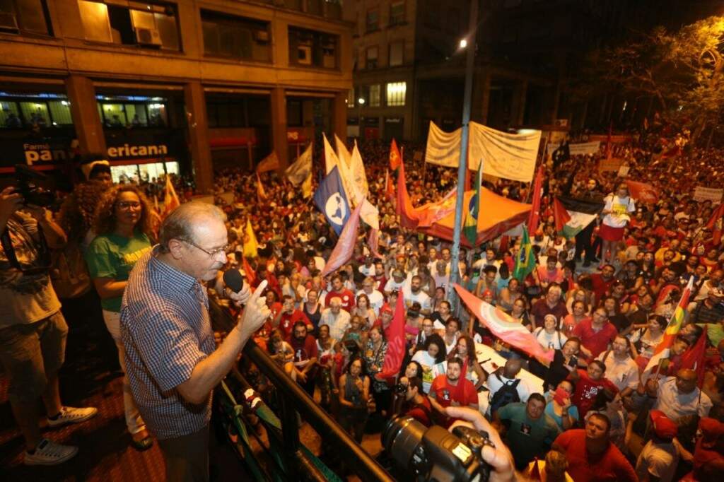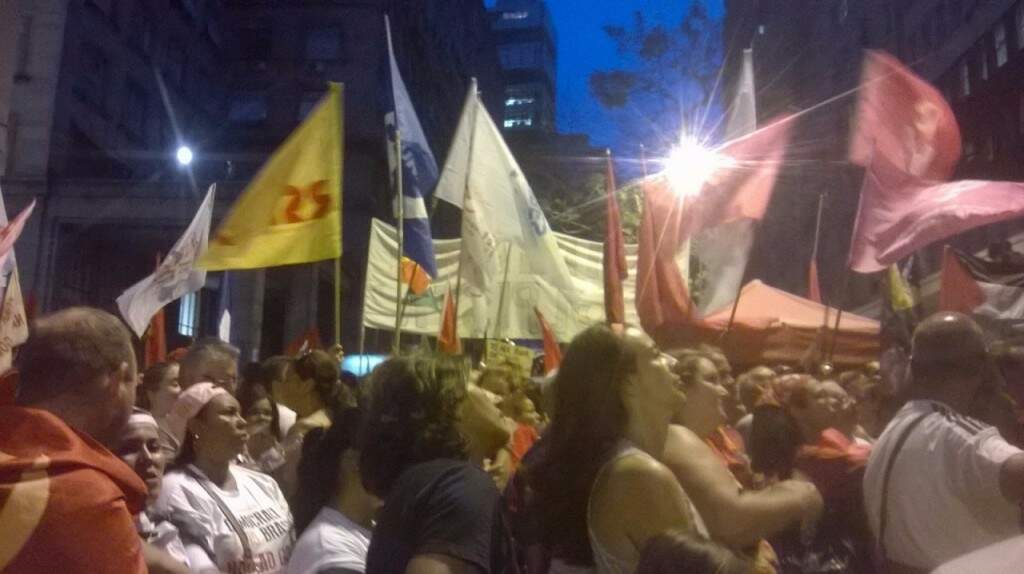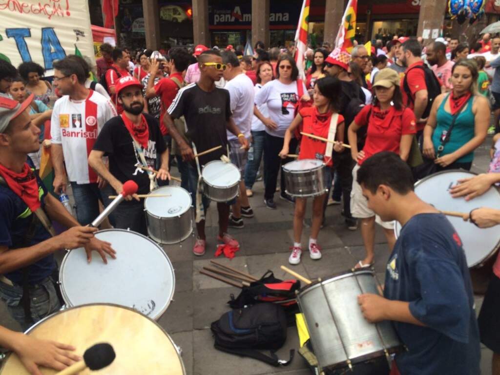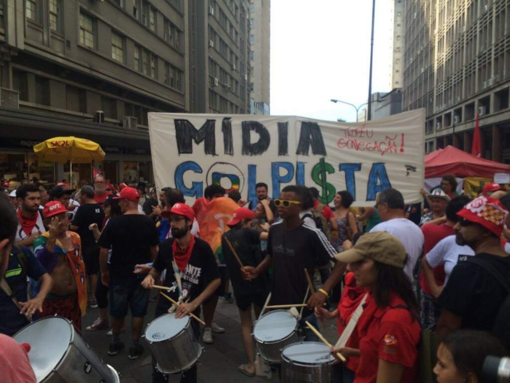 Manifestantes favoráveis ao governo Dilma Rousseff fazem caminhada pela avenida Borges de Medeiros na noite desta sexta-feira. O grupo se concentrou na Esquina Democrática, área Central de Porto Alegre. O Comando de Policiamento da Capital informou que a área conta com reforço de efetivo na região atendida pelo 9º BPM (Batalhão de Polícia Militar).