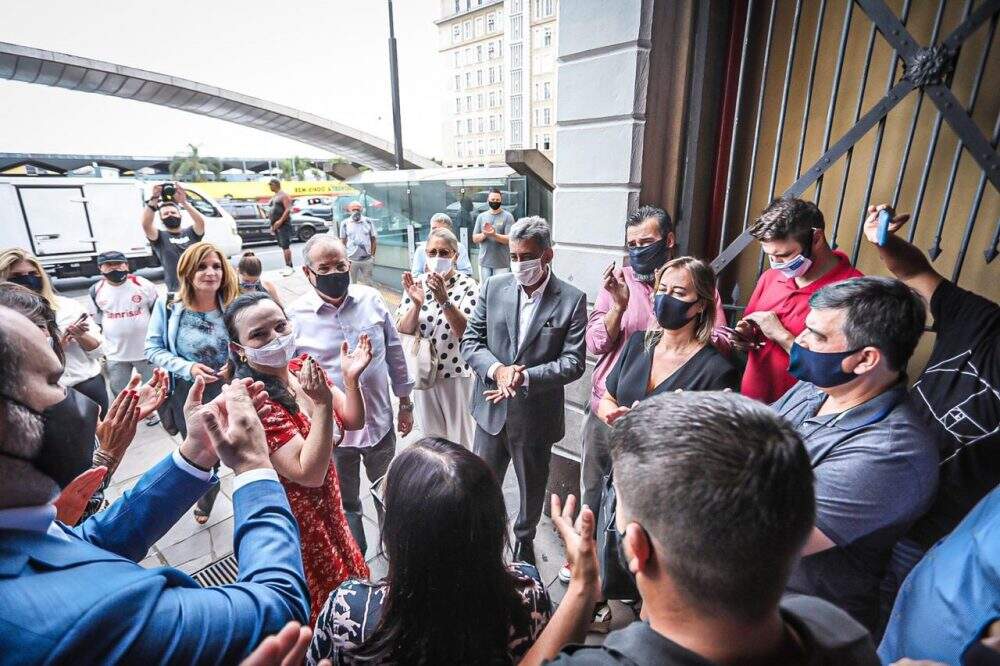 Após a publicação de um novo decreto da prefeitura que flexibiliza as atividades comerciais em Porto Alegre, um ato simbólico marcou, na manhã desta terça-feira (5), a reabertura do portão do Mercado Público localizado na avenida Júlio de Castilhos.