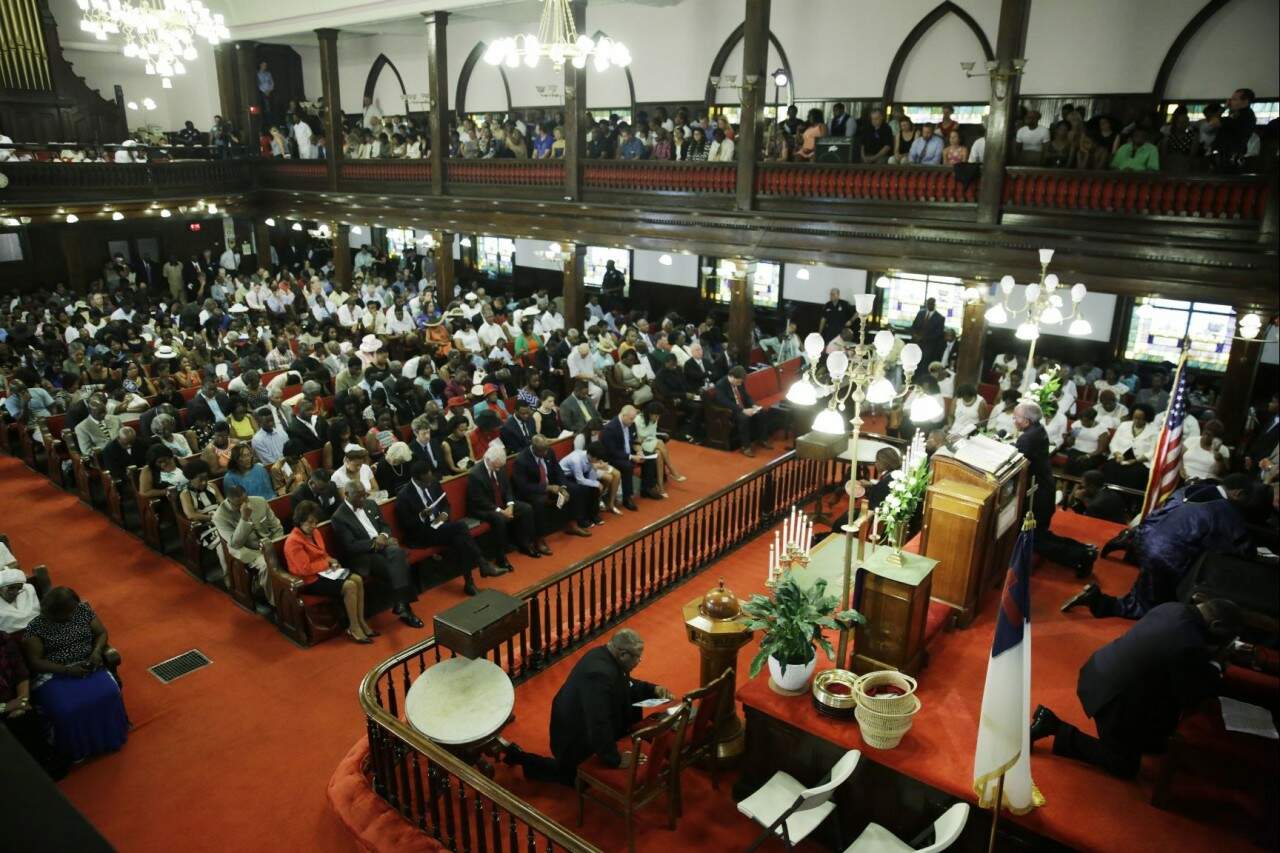 A igreja metodista Emanuel recebeu na manhã desse domingo sua primeira cerimônia religiosa depois do ataque. A celebração, que prestou homenagens aos mortos, teve orações e hinos religiosos. Alguns dos cerca de 400 fiéis presentes derramaram lágrimas ao ouvir os primeiros acordes do órgão. Sinos foram tocados para lembrar as vítimas.