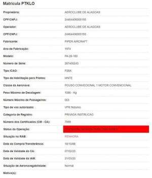 A aeronave Piper Cherokee PT-KLO só poderia fazer fazer voos de treinamento ou de instrução. Ou seja, o avião não poderia fazer voos privados ou táxi aéreo. Este tipo de infração é conhecida no meio como “táxi aéreo clandestino”. O avião pertence ao Aeroclube de Alagoas. Uma da vítimas era piloto e a outra diretor do aeroclube.
