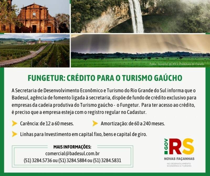 Foto: DivulgaçãoO Badesul, agência de fomento ligada à Secretaria de Desenvolvimento Econômico e Turismo, dispõe de um fundo de crédito exclusivo para empresas da cadeia produtiva do turismo gaúcho. Por meio do Fungetur (Fundo Geral de Turismo), os empresários podem buscar recursos para investimentos em seus negócios.