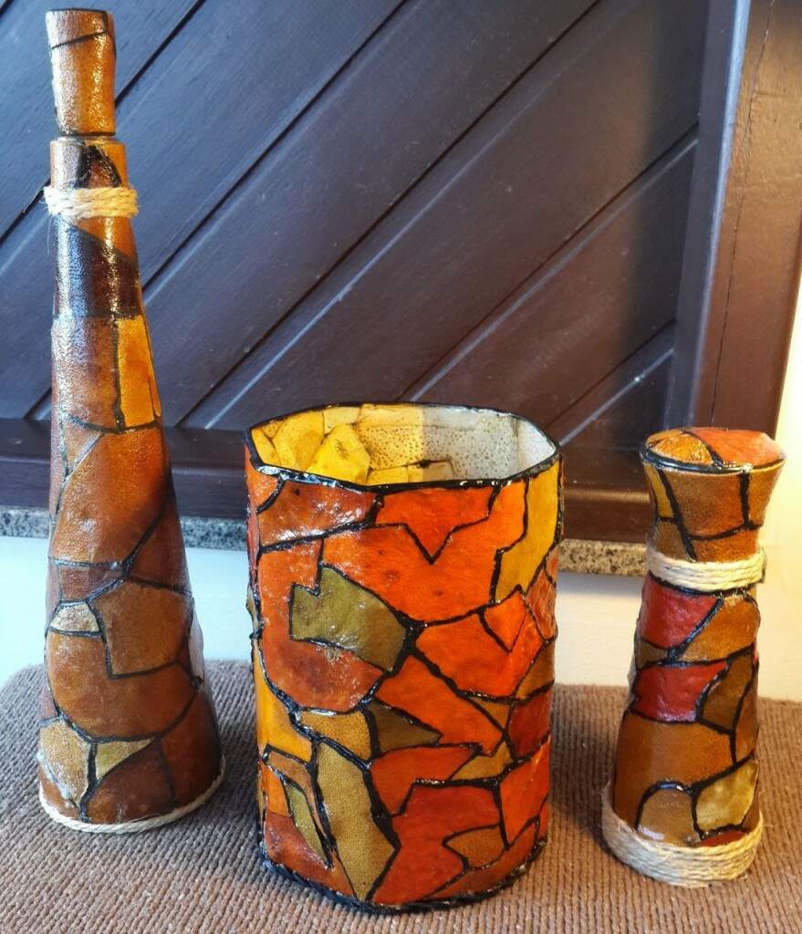 As peças são joias e decorações feitas com cascas de frutas desidratadas e resinadas, folheadas a ouro ou prata.