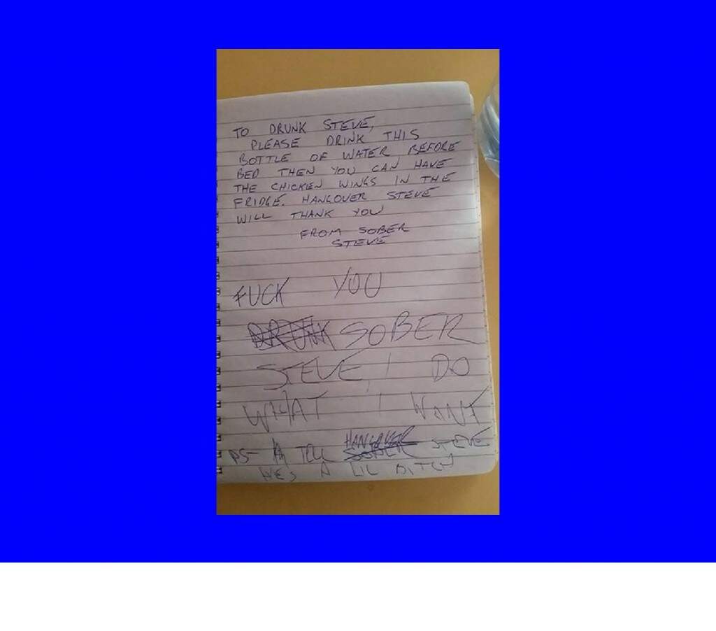 A noite prometia ser de muita bebedeira, por isso, o australiano Steven Davidson deixou um bilhete com dicas para curar a ressaca no dia seguinte. Após voltar para casa embriagado, no entanto, “Steven bêbado” não gostou muito do recado e acabou discutindo com si mesmo.