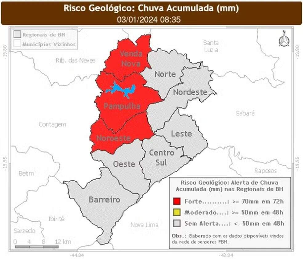 Foto: Defesa Civil de Belo Horizonte/DivulgaçãoA Defesa Civil emitiu, nesta quarta-feira (3), alerta de risco geológico forte para três regiões de Belo Horizonte (MG). Segundo a prefeitura, cerca de mil imóveis estão nestas áreas, principalmente em vilas e favelas. A advertência é válida até a próxima segunda-feira (8).