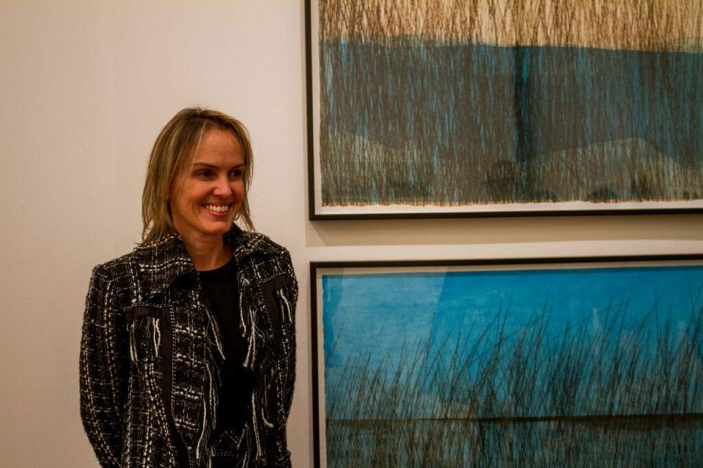 A artista Cris Rocha, integrante do grupo Em Branco, junto a suas telas na abertura da exposição “Água, paisagem alterada”. (Foto: Pedro Antonio Heinrich/especial)