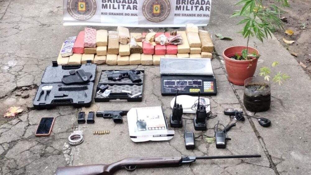 Com ele foi apreendida uma pistola calibre 9 milímetros, dois carregadores de arma de fogo, oito munições de calibre 9 milímetros, uma espingarda e uma pistola de pressão, uma algema, 31 tijolos de maconha, pesando, ao total, aproximadamente 25kg, quatro rádios comunicadores e duas balanças de precisão.