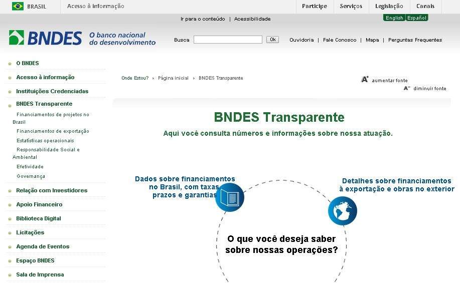 O BNDES (Banco Nacional de Desenvolvimento Econômico e Social) passou a divulgar, por meio do site BNDES Transparente (http://www.bndes.gov.br/bndestransparente), o valor da taxa de juros cobrada nas operações de crédito para exportações de serviços a outras nações, como Cuba, Angola, Argentina e República Dominicana, entre outros. Até então, o banco divulgava somente o valor dos contratos, nome do beneficiário, localização geográfica e descrição do projeto.