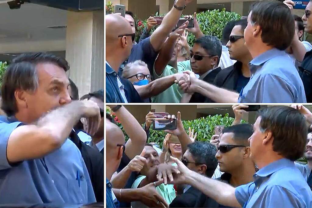 Em um dos momentos, Bolsonaro foi cercado por moradores e, antes de entrar no carro, ignorou orientações sanitárias e, sem demonstrar nenhuma preocupação com a crise do coronavírus, primeiro coçou o nariz com o dorso da mão direita e, segundos depois, passou a cumprimentar uma idosa e outros apoiadores.