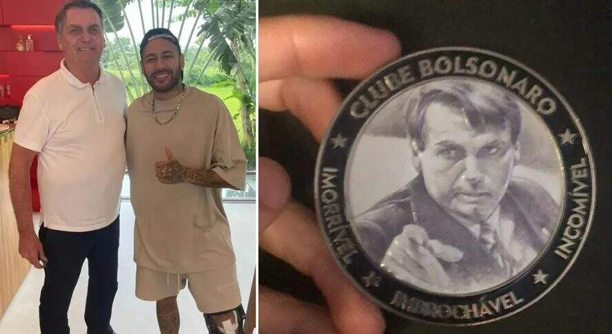Foto: Reprodução/InstagramJair Bolsonaro (PL) entregou ao jogador Neymar uma medalha com a imagem do ex-presidente estampada e as palavras “imorrível, imbrochável e incomível”. O objeto tem sido distribuído por Bolsonaro a aliados e apoiadores.