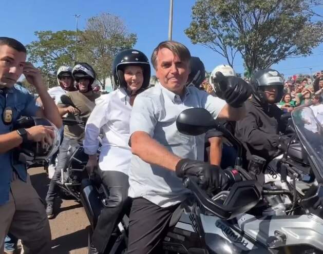 Após entregar 300 moradias populares a moradores de Campo Grande (MS), o presidente Jair Bolsonaro (PL) saiu em passeio de moto com a ex-ministra da Agricultura Tereza Cristina nesta quinta-feira (30). Bolsonaro estava de luvas nas mãos, mas sem capacete. A deputada federal portava o objeto de segurança.