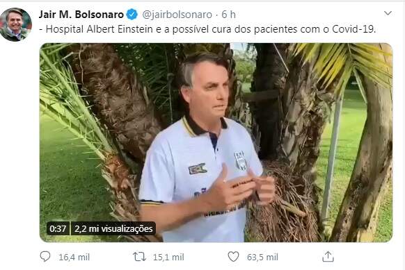 Na postagem, o presidente escreve “Hospital Albert Einstein e a possível cura dos pacientes com Covid-19”.