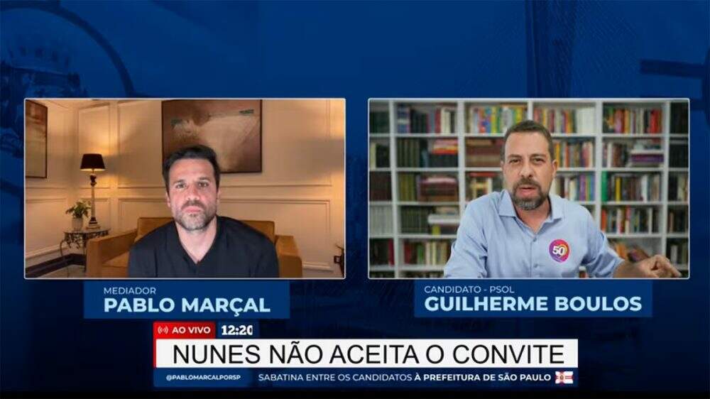 Ricardo Nunes (MDB) foi convidado para a sabatina, mas não participou. Segundo divulgou o blog da Andréia Sadi, no g1, para a campanha de Nunes, trazer Marçal de volta ao cenário da disputa eleitoral era um erro e um “papelão” de Boulos.
