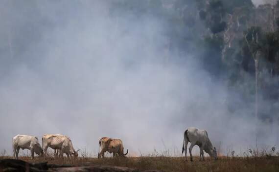 Gado pasta em meio à fumaça causada por um foco de queimada da Amazônia em Rio Pardo, Rondônia, em setembro de 2019.