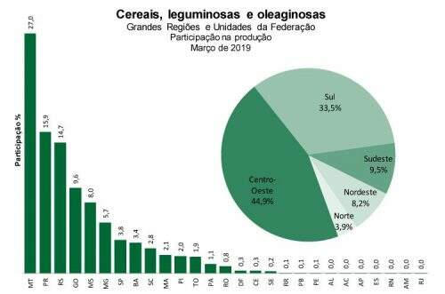 Os maiores representantes estão ligados a produção de soja (112,5 milhões de toneladas), milho (65,4 milhões de toneladas) e arroz (10,5 milhões de toneladas), que, juntos, somam 87,2% dos itens a serem colhidos. O Mato Grosso obtém 27% das plantações, seguido do Paraná, cuja participação é de 15,9%. O Rio Grande do Sul ocupa o terceiro lugar neste ranking, responsável por 14,7% das áreas de produção. Apenas estes três estados configuram 57,6% do total nacional.