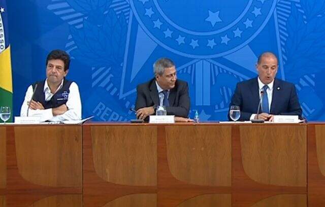 Os ministros Luiz Henrique Mandetta (Saúde), Walter Braga Netto (Casa Civil) e Onyx Lorenzoni (Cidadania).