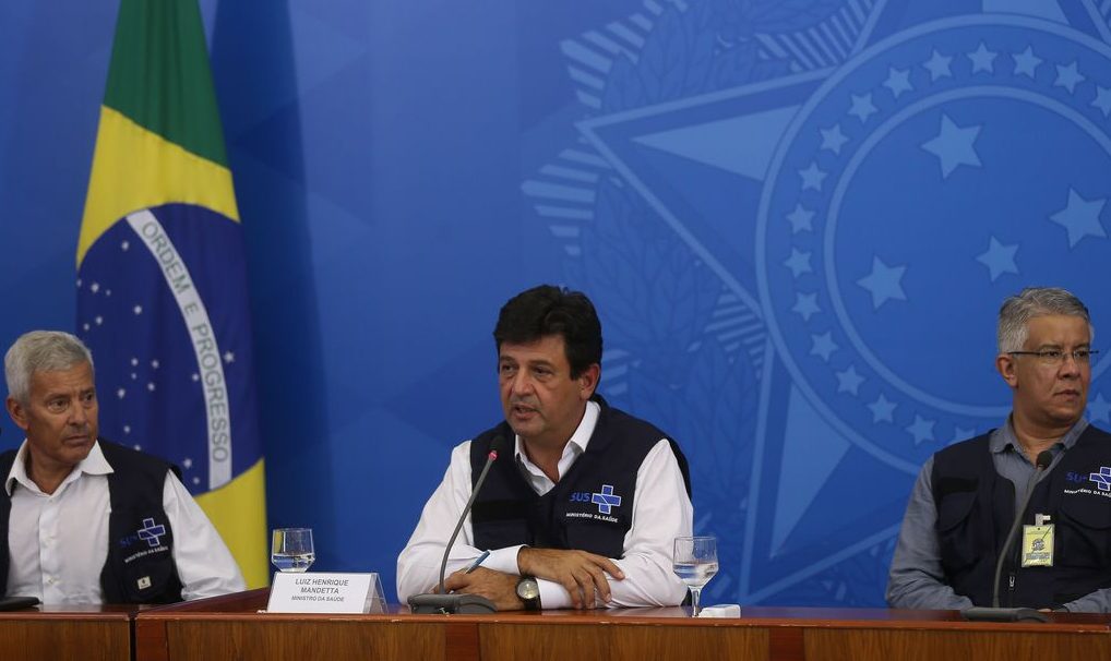 O secretário-executivo do Ministério da Saúde, João Gabbardo dos Reis, o ministro da Saúde, Luiz Henrique Mandetta e o secretário de Vigilância em Saúde, Wanderson Kleber de Oliveira, durante a coletiva de imprensa.