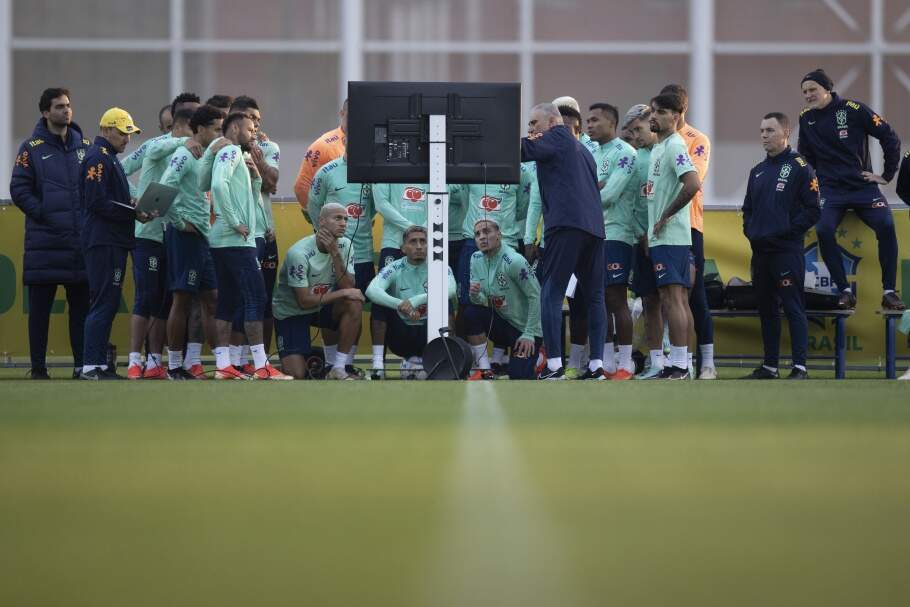 Foto: Lucas Figueiredo/CBFO técnico Tite ainda não definiu quem serão os titulares da Seleção Brasileira que vão enfrentar a Sérvia na estreia do Brasil na Copa do Mundo, na próxima quinta-feira (24). Ao menos no vestiário, Richarlison, Neymar e Raphinha ficam lado a lado.