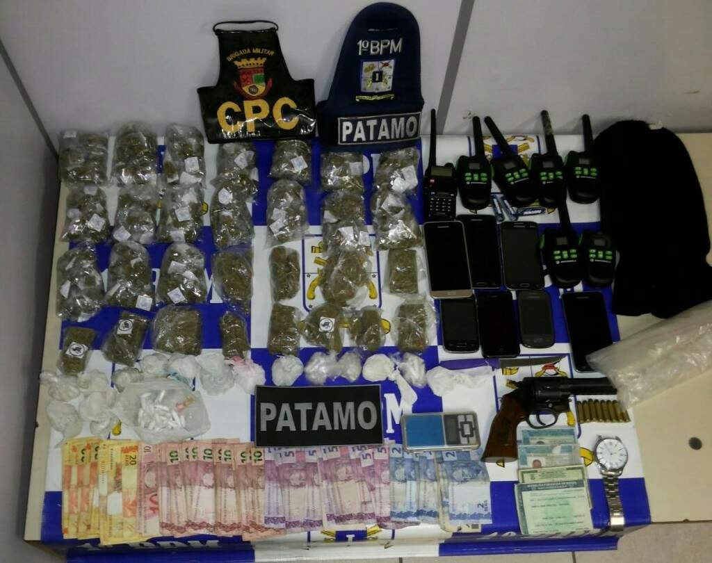 Com os indivíduos foram apreendidos pacotes de cocaína embaladas em pinos pronta para a venda (ainda não contabilizada), pacotes fechados de maconha embaladas em sacos plásticos preparados para a venda (ainda não contabilizados), balança de precisão, dinheiro em notas fracionadas, munições, touca ninja, anotações com a contabilidade do tráfico, diversos rádios comunicadores, equipamento na frequência da Brigada Militar e duas mochilas.