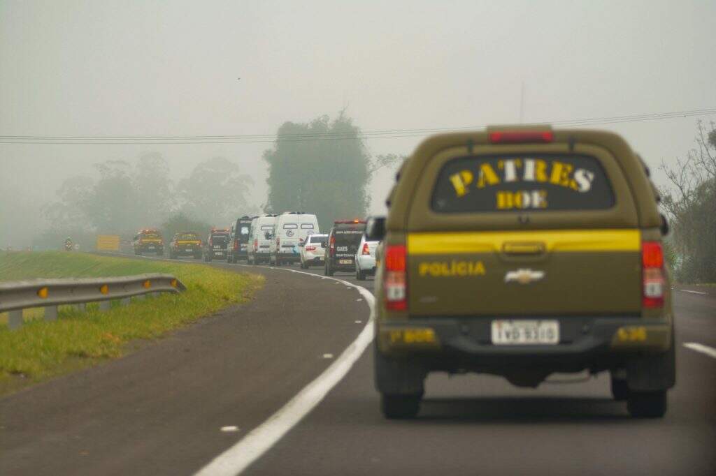 Batedores motociclistas e as Patrulhas Especiais do 1º e 3º BOEs ajudaram as autoridades na escolta até a Base Aérea de Canoas dos presos de alta periculosidade.