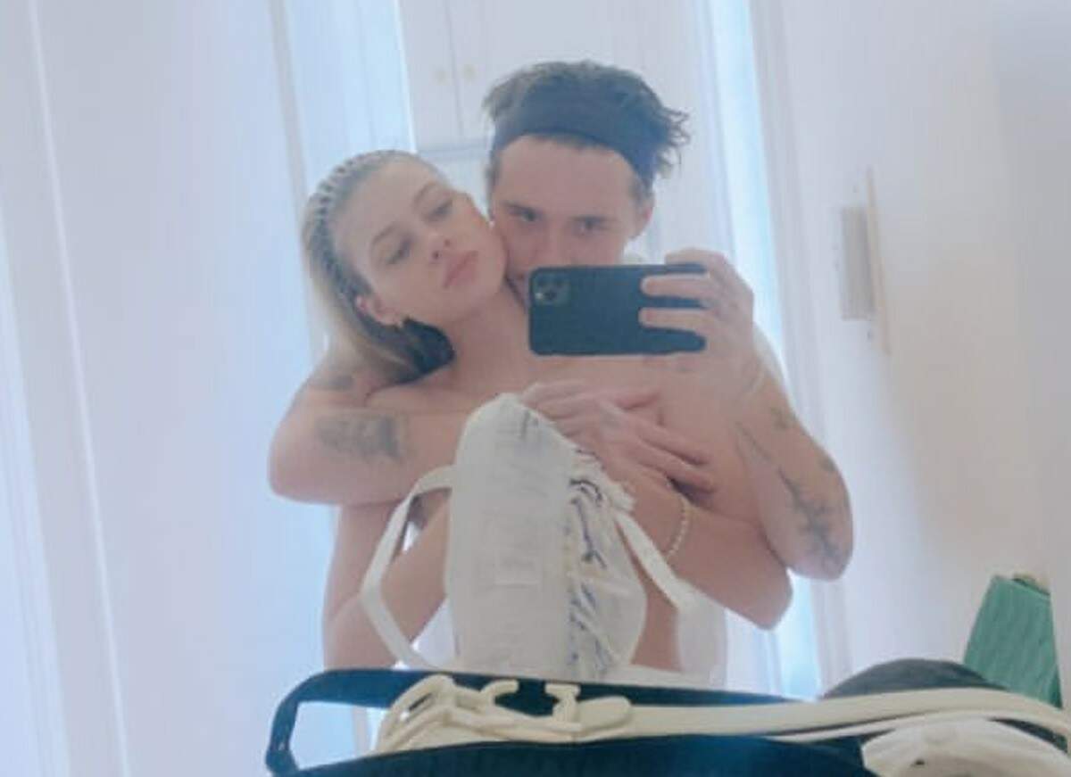 Foto: Reprodução/InstagramBrooklyn Beckham subiu a temperatura da web ao publicar novo clique com a noiva, Nicola Petlz. O jovem, que é filho de David e Victoria Beckham, postou foto Instagram em que aparece nu com a amada, com os dois sendo cobertos apenas por uma bolsa dela.