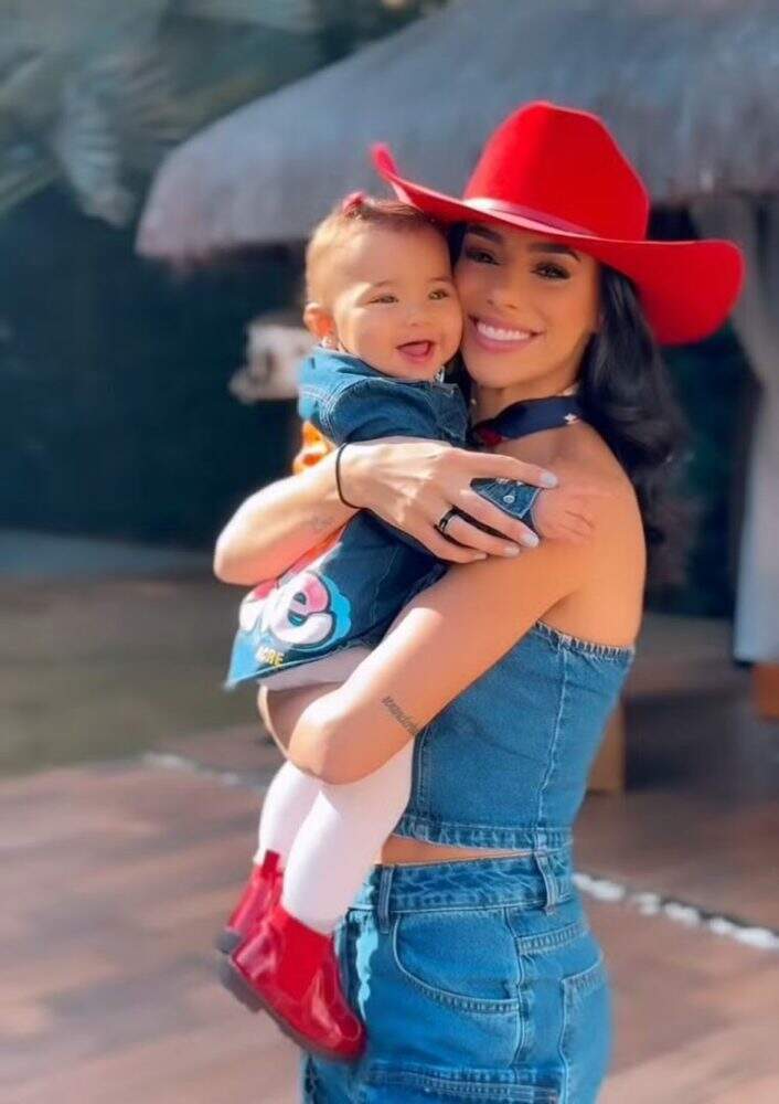 Já Bruna e Mavie combinaram os looks jeans. Enquanto a pequena usou um vestido com uma foto dela com o pai e ‘Mavie’ escrito nas costas, com uma botinha vermelha, a mamãe foi de cropped e calça cargo.