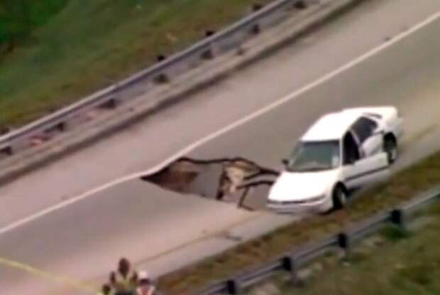 Um motorista dirigia por uma estrada na Flórida, nos Estados Unidos, quando buraco gigante surgiu à frente e seu carro quase foi engolido. Ele ficou desesperado, mas conseguiu escapar por pouco. Inicialmente o Corpo de Bombeiros pensou que se tratasse de um sumidouro – abertura natural pela qual água entra no solo –, mas o afundamento de pista foi provocado por danos em uma obra.