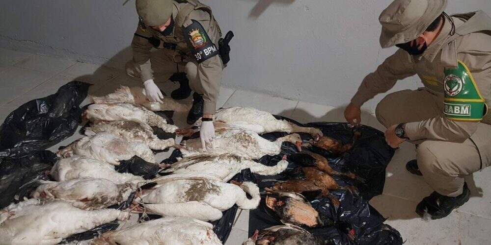 Na inspeção, os policiais militares encontraram 19 aves abatidas, sendo 12 gansos, quatro marrecas-caneleiras, dois marrecões da patagônia e uma marreca pé-vermelho. Duas espingardas calibres 12, sendo que uma delas sem registro, além de 241 munições, foram também localizadas.