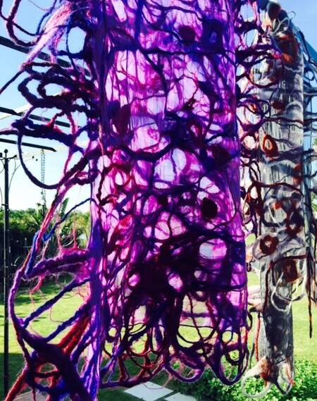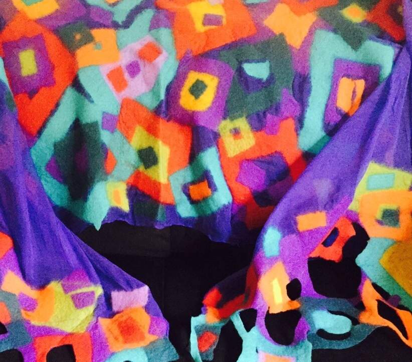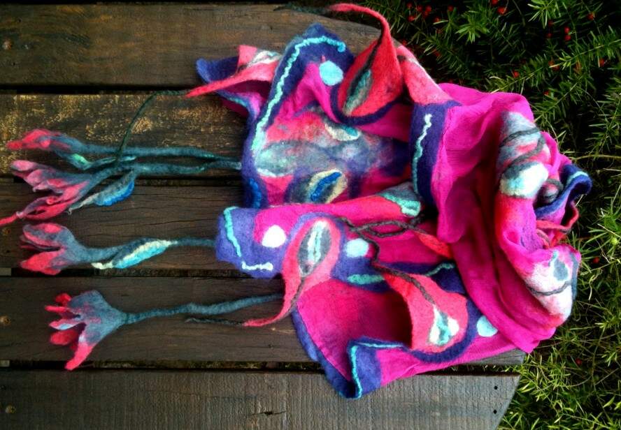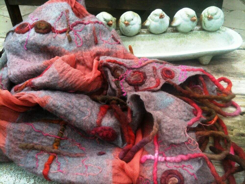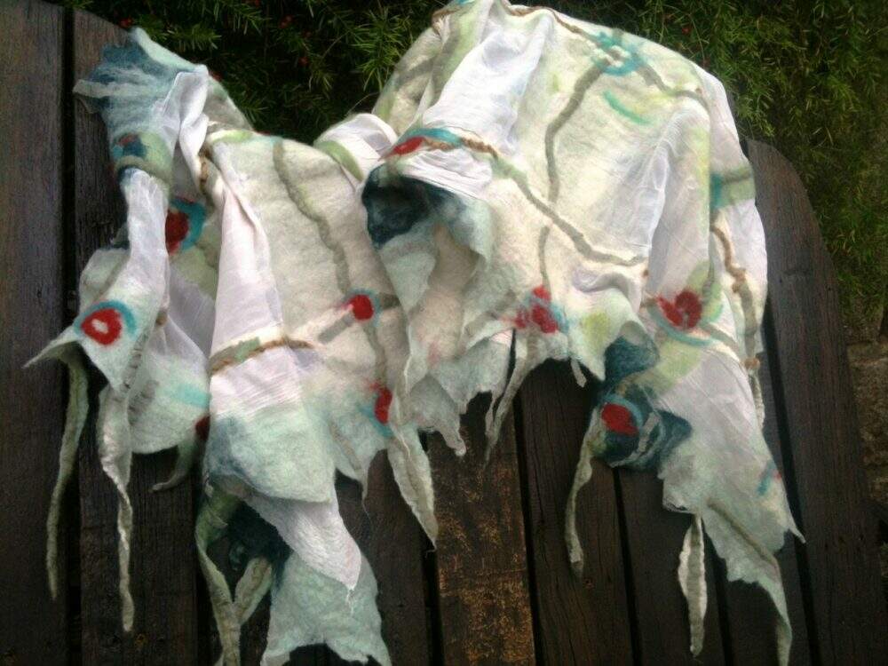 As mantas e pelerines foram confeccionadas à mão em processo de feltragem, técnica milenar gerada pelo atrito das fibras emaranhadas de lã pura extrafina, tingida de modo artesanal, sobre a seda pura. As peças têm designer criado para aguçar diferentes sentidos.