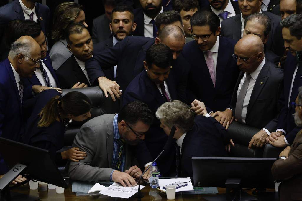 Motta conseguiu recuperar a cadeira às 22h21 desta quarta-feira após uma longa negociação com a oposição mediada por seu antecessor, Arthur Lira (PP-AL). O presidente da Casa demorou mais de seis minutos para atravessar o mar de deputados bolsonaristas que ocuparam a Mesa da Câmara desde terça-feira (5).