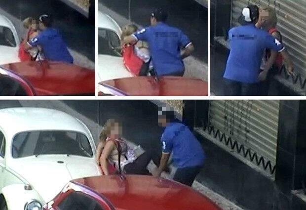 Em seguida, o homem empurra a companheira contra uma porta metálica na vitrine de uma loja e dá uma cabeçada. Após discutirem novamente, ele segura o pescoço dela, simulando um enforcamento e dá dois tapas no rosto da mulher. As imagens foram apresentadas no plantão policial.