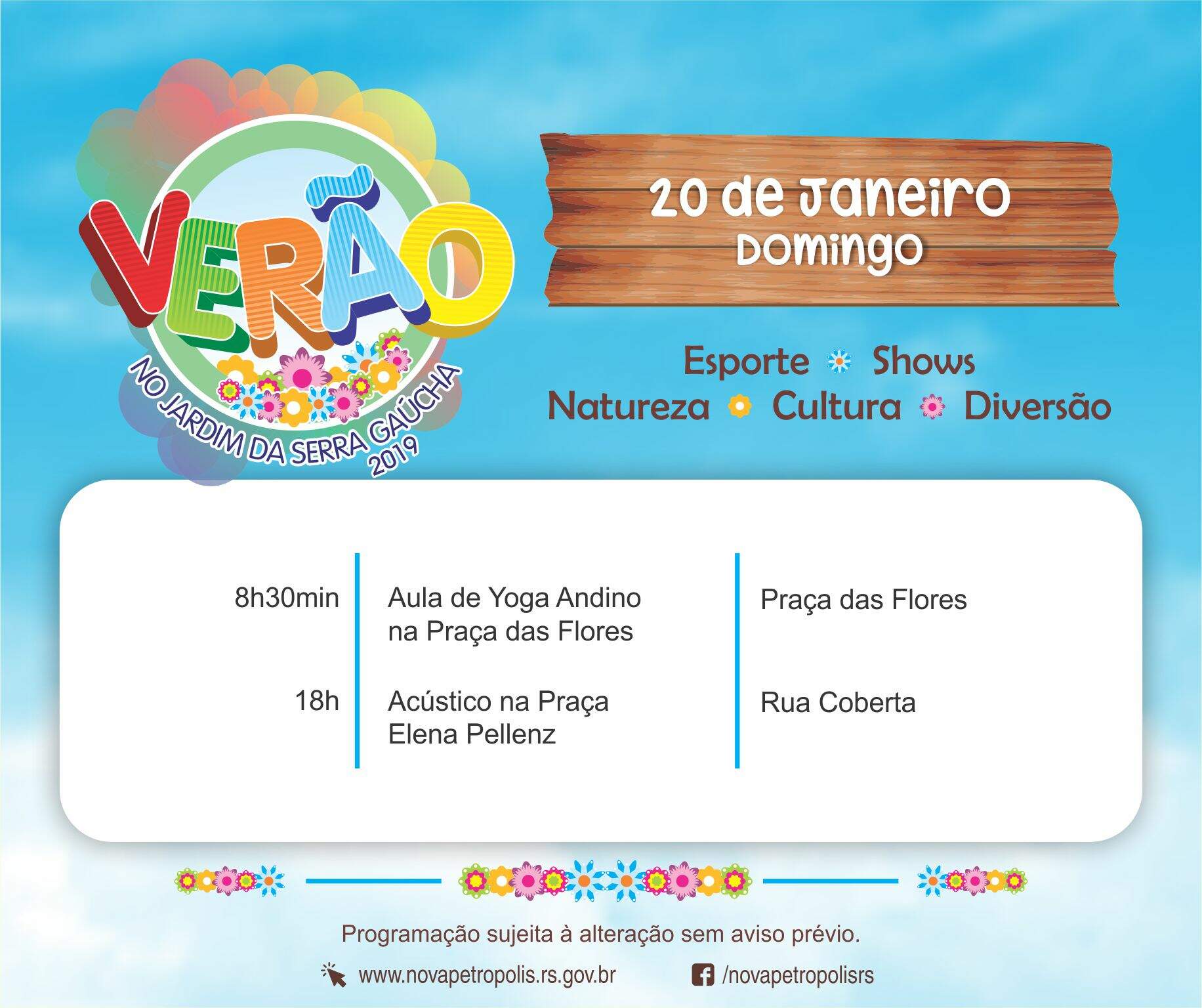 O Verão no Jardim da Serra Gaúcha também proporciona uma experiência de conexão com a sabedoria ancestral do Yoga e os ensinamentos andinos, conduzidos por Munay Flores, no domingo, 20 de janeiro, das 8h30min às 10h, na Praça das Flores. Não é necessário ter experiência com yoga, basta levar um pano ou tapetinho. A atividade é gratuita. Inscrições e informações: mamagaiacomunidade@gmail.com. A aula de yoga andino tem a organização da Mama Gaia Comunidade.