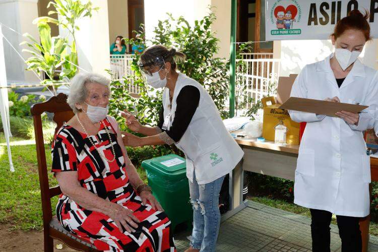Foto: Cristine Rochol/PMPADepois de 10 meses confinados devido à pandemia provocada pelo coronavírus, os idosos que residem no Asilo Padre Cacique receberam, na terça-feira (19), a primeira dose da vacina Coronavac contra a Covid-19. Idosos e funcionários que trabalham no asilo foram imunizados nesta tarde.