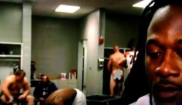 Na cena, diversos atletas do time são vistos trocando de roupa após o duelo contra o Buffalo Bills, tirando completamente o foco do que Jones falava sobre a partida.