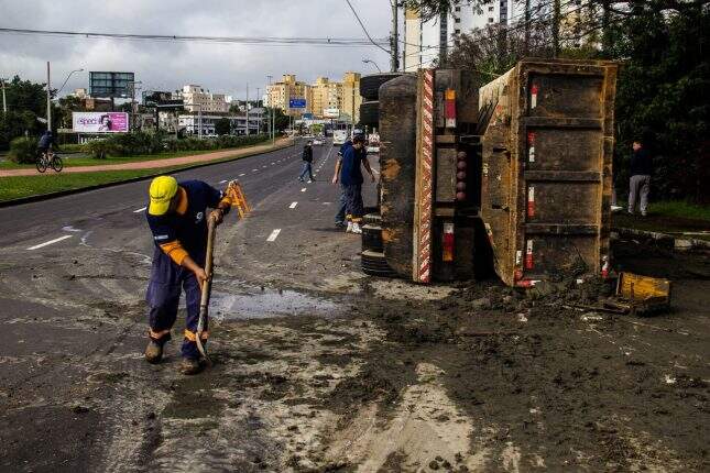 Porto Alegre 21.07.15 – Caminhão tomba, com carga de cimento, na Av. Diário de Notícias. – FOTO – Jackson Ciceri