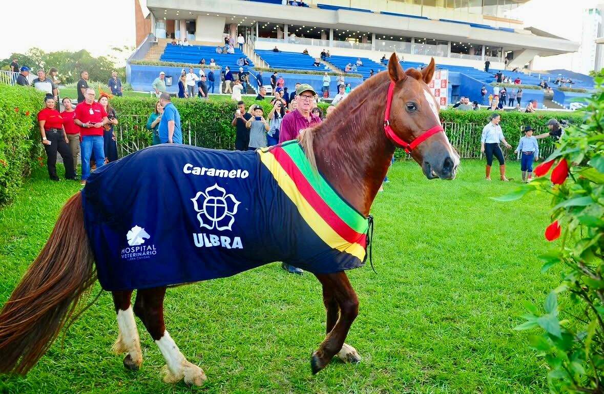 Foto: Ricardo Rimol/Jockey Club RSO cavalo Caramelo, símbolo de superação das enchentes que atingiram o Rio Grande do Sul, em 2024, foi homenageado no último sábado (25) no Jockey Club de Porto Alegre. Durante a programação, o sexto páreo recebeu uma medalha com o nome do animal, em reconhecimento à sua história e ao impacto que gerou em todo o País.