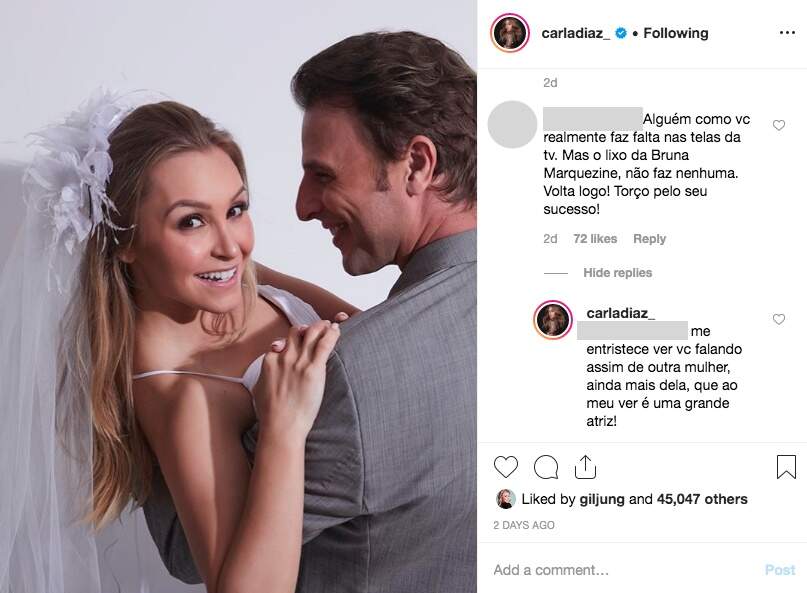 A atriz Carla Diaz manifestou-se a favor de Bruna Marquezine após ler um comentário maldoso no Instagram. Na tentativa de elogiar Carla, uma internauta acabou atacando Marquezine.