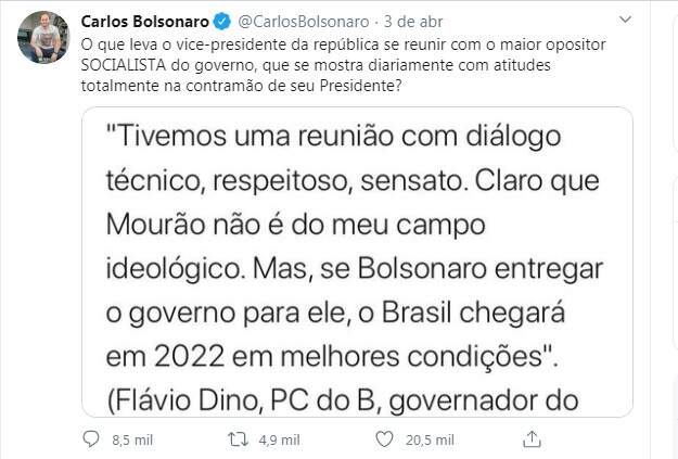 O vereador Carlos Bolsonaro (Republicanos-RJ), filho presidencial responsável pela estratégia digital do pai, atacou o vice-presidente Hamilton Mourão (PRTB) em uma postagem no Twitter na sexta-feira (3). Insinuou que ele conspira para derrubar seu pai.