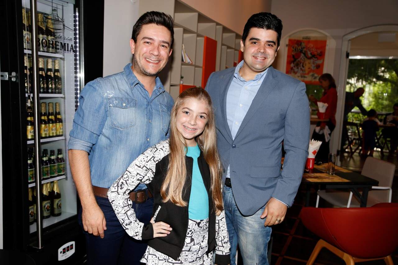 Geraldo Brandeburski com a filha, Pietra Brandeburski, e Claudio Cupertino, que festeja o êxito de sua mostra no exterior. (Foto: Lenara Petenuzzo/especial)