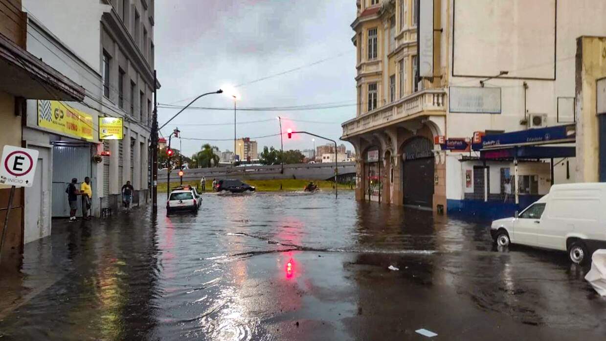 Um dos pontos que voltou a alagar nesta segunda foi a avenida Sarandi, próximo à rua Zeferino Dias, na Zona Norte da capital gaúcha. A forte chuva causou o transbordo do arroio Passo das Pedras.