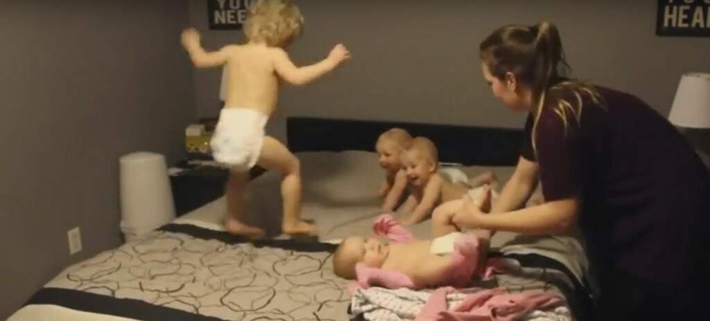 Se um bebê já dá trabalho, imagine quatro. A mãe Corrie-Lynn Whyte publicou um vídeo no Facebook mostrando o que ela enfrenta em seu dia a dia para vestir seus quatro bebês para dormir. Ela e o marido, Dan Gibson, são pais de Emily, 2 anos, e dos trigêmeos de 8 meses Olivia, Jackson e Levi. As crianças não param enquanto Corrie enfrenta uma verdadeira batalha para vestir as roupinhas nos pequenos.