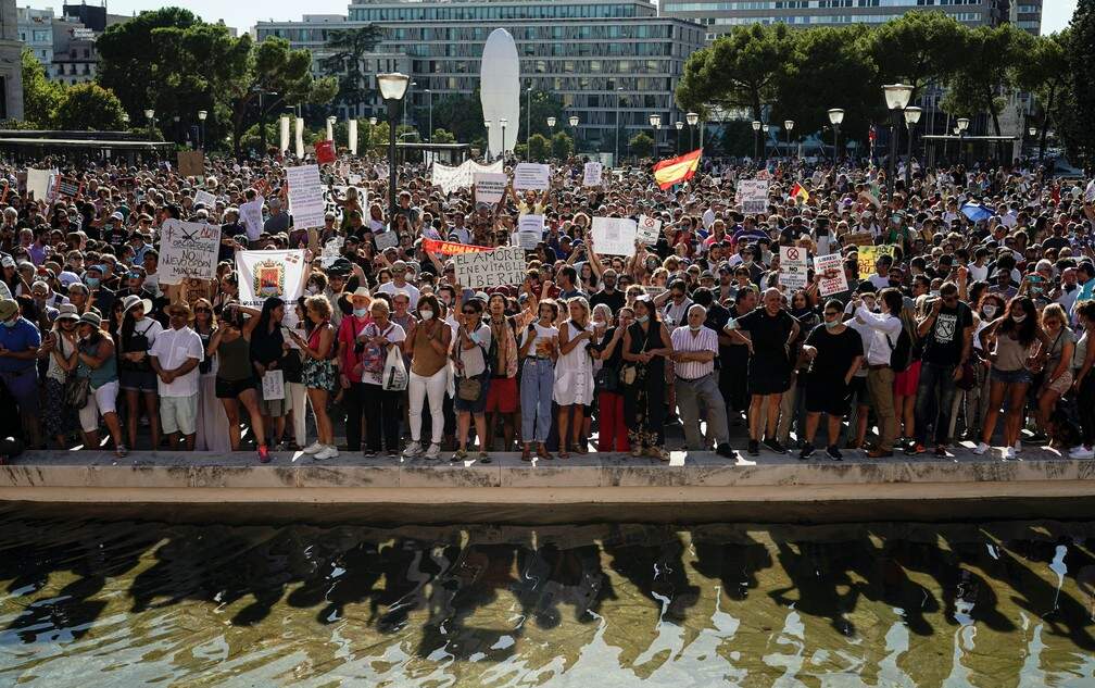 A manifestação, organizada nas redes sociais, começou sob a enorme bandeira espanhola na praça Colón, no centro da Capital. Os manifestantes exibiam cartazes que diziam “O vírus não existe”, “as máscaras matam” ou “não temos medo”.