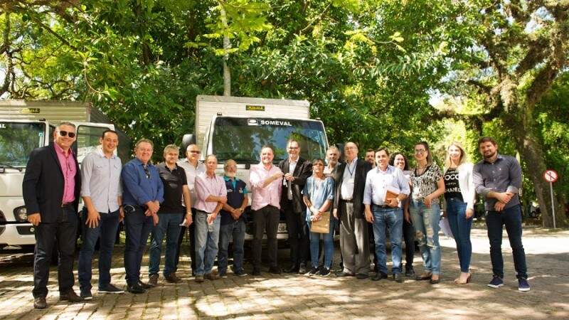 Em cerimônia no pátio da Seapdr, em Porto Alegre, o secretário Covatti Filho entregou as chaves dos caminhões para o secretário da Agricultura de Viamão, Marco Antonio Nunes Vieira, e para o secretário de Desenvolvimento Econômico de Porto Alegre, Eduardo Cidade.