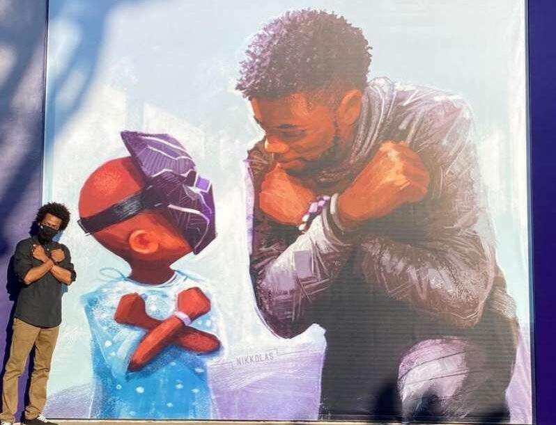 O desenho mostra Boseman fazendo a saudação de “Wakanda forever” para um fã mirim, que o imita com uma máscara do herói Pantera Negra. O artista responsável, Nikkolas Smith (que faz parte da equipe de “Space Jam: O Novo Legado”), também publicou imagens do mural em seu Instagram pessoal.