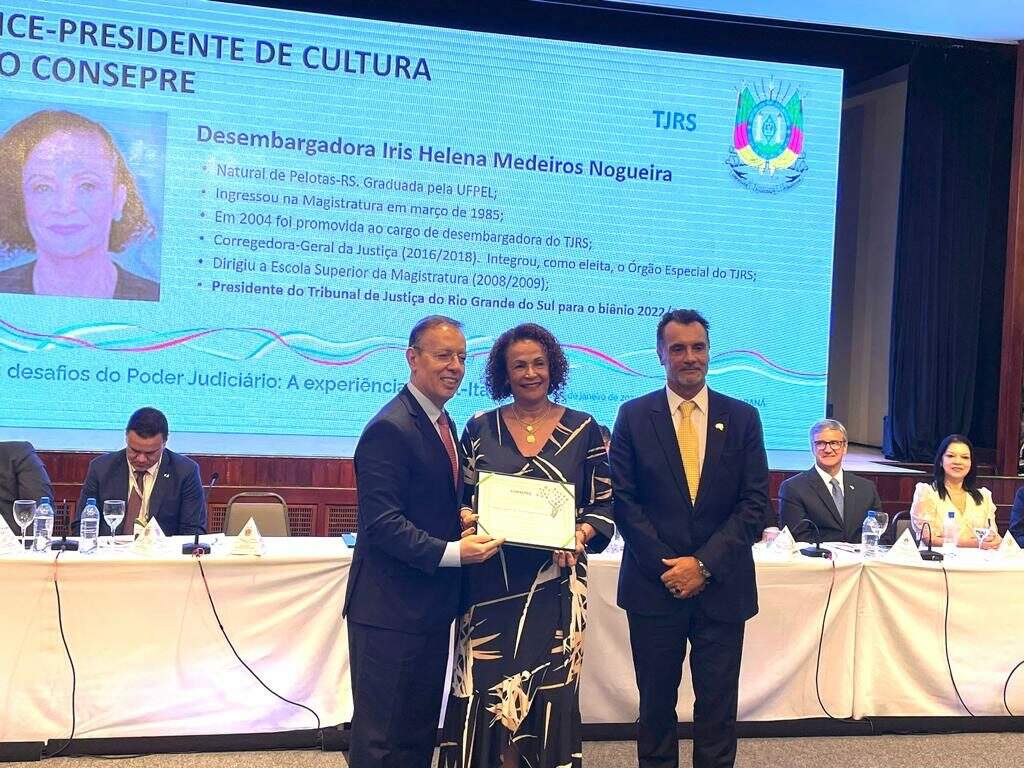 A presidente do TJ-RS (Tribunal de Justiça do Rio Grande do Sul), desembargadora Iris Helena Medeiros Nogueira, foi empossada como vice-presidente Cultural do Consepre (Conselho de Presidentes de Tribunais de Justiça do Brasil), durante cerimônia realizada na noite de quinta-feira (19), no “Simpósio Novos Desafios do Poder Judiciário: A experiência Brasil-Itália”, em Foz do Iguaçu (PR).