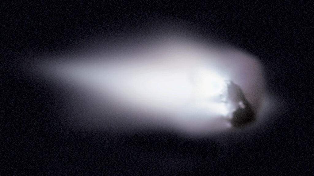 Bem, mas se são pedacinhos do Halley, onde está o cometa? Muito longe daqui, se afastando cada vez mais do nosso planeta após sua última passagem pelas redondezas, em 1986. A cada aproximação do Sol, que ocorre periodicamente em intervalos de 76 anos, ele produz uma bonita cauda e dispersa detritos por onde passa. São justamente esses pedacinhos deixados pela última passagem que aparecem como estrelas cadentes todo ano, quando a Terra atravessa a órbita do cometa.