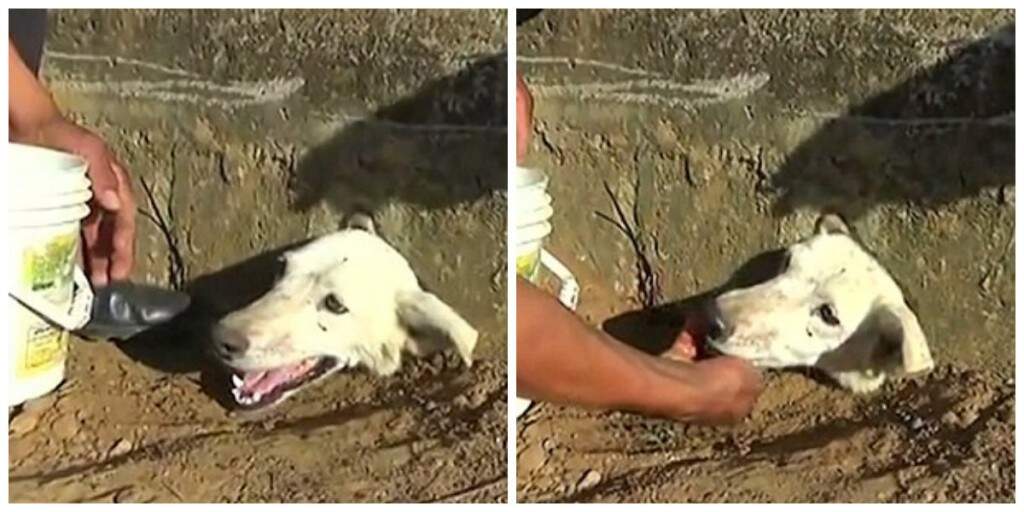 Os moradores de uma cidade se uniram para libertar uma cadela que ficou com a cabeça presa em uma parede de concreto.