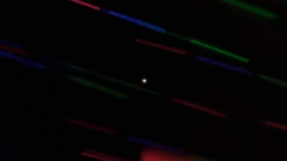 A foto foi feita com o telescópio Gemini North, de 8 metros, nesta segunda-feira (24). Foram usados três filtros de cor (azul, verde, vermelho) e o telescópio se moveu para acompanhar o objeto, no centro da imagem. Por isso as estrelas ao redor aparecem como rastros coloridos.