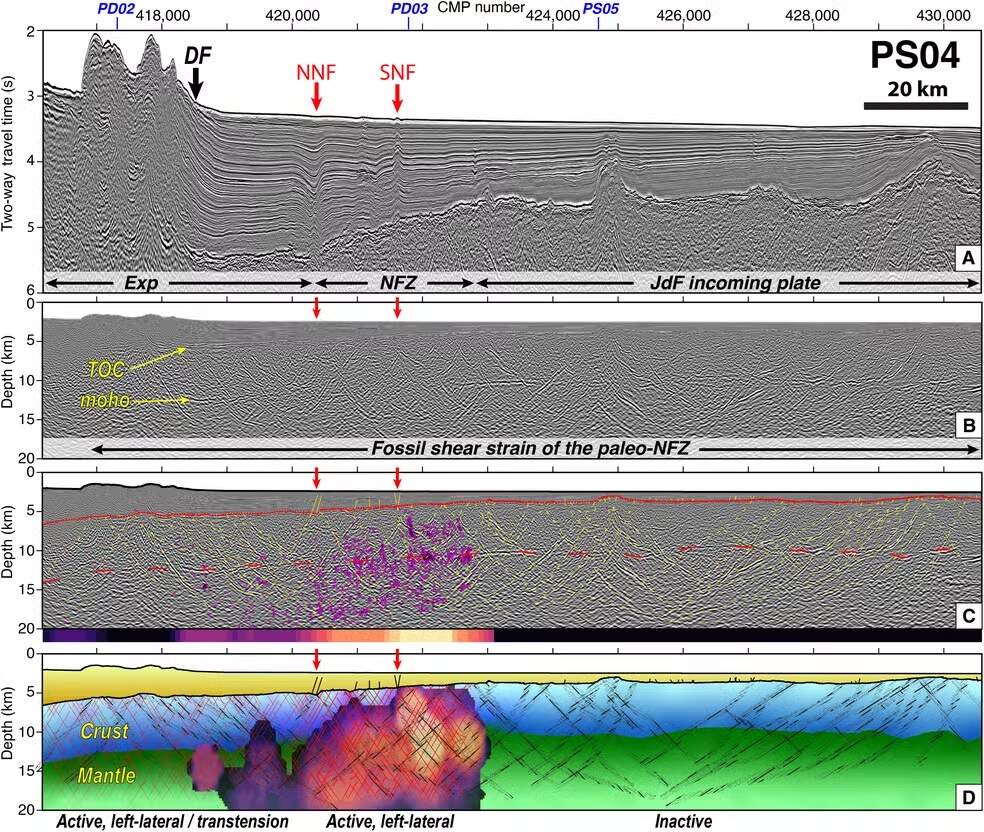 É exatamente isso que os pesquisadores observaram na região de Cascadia: uma zona de subducção em colapso, onde o processo de mergulho das placas está dando lugar a um movimento lateral, típico das chamadas falhas transformantes — como a famosa Falha de San Andreas, na Califórnia.