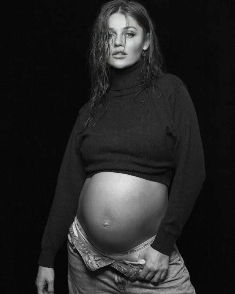 “Chegando na 31ª semana. Dor nas costas, dificuldade para dormir e o peso estão babado! Os chutes, então! [emoji com língua para fora] e AMO mais que tudo, Aurora [emoji de coração roxo]”, escreveu ela na legenda da imagem em que aparecia com a barriguinha à mostra.